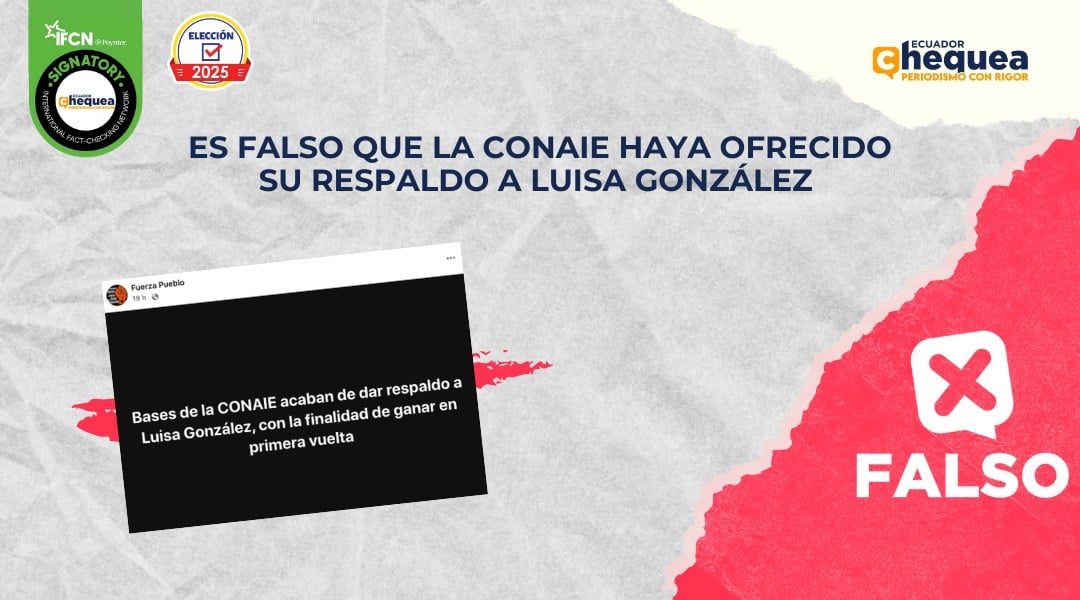 Por ejemplo, en Facebook, una publicación señala que las “bases de la Confederación de Nacionalidades Indígenas del Ecuador (Conaie) acaban de dar el respaldo a la candidata del correísmo, Luisa González, con la finalidad de ganar en primera vuelta”. Se califica este contenido como falso. La Conaie aseguró a Ecuador Chequea que respalda al candidato de Pachakutik, Leonidas Iza. Esta es una organización índigena y social, mientras que Pachakutik es el movimiento político.