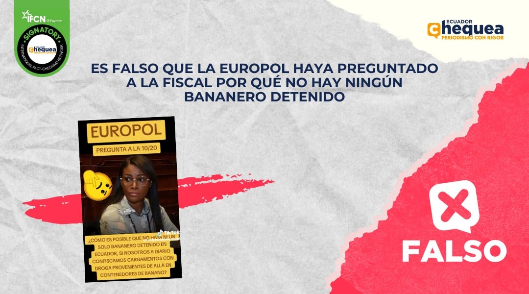 Una publicación realizada en Facebook, por ejemplo, asegura que Europol le habría preguntado a la Fiscal: “¿Cómo es posible que no haya ni un solo bananero detenido en Ecuador, si nosotros a diario confiscamos cargamentos de droga provenientes de allá en contenedores de banano?”. Calificamos este contenido como falso. No se encontraron registros de que Europol haya dado estas declaraciones o que haya emitido algún comunicado. Además, Fiscalía aseguró que continúa trabajando en investigaciones conjuntas con la agencia europea.