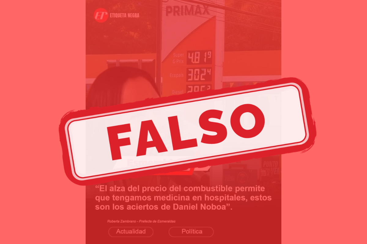 - Qué verificamos: Una imagen que atribuye a la prefecta de Esmeraldas, Roberta Zambrano, una supuesta frase sobre el alza de combustibles y el abastecimiento de medicinas en hospitales.