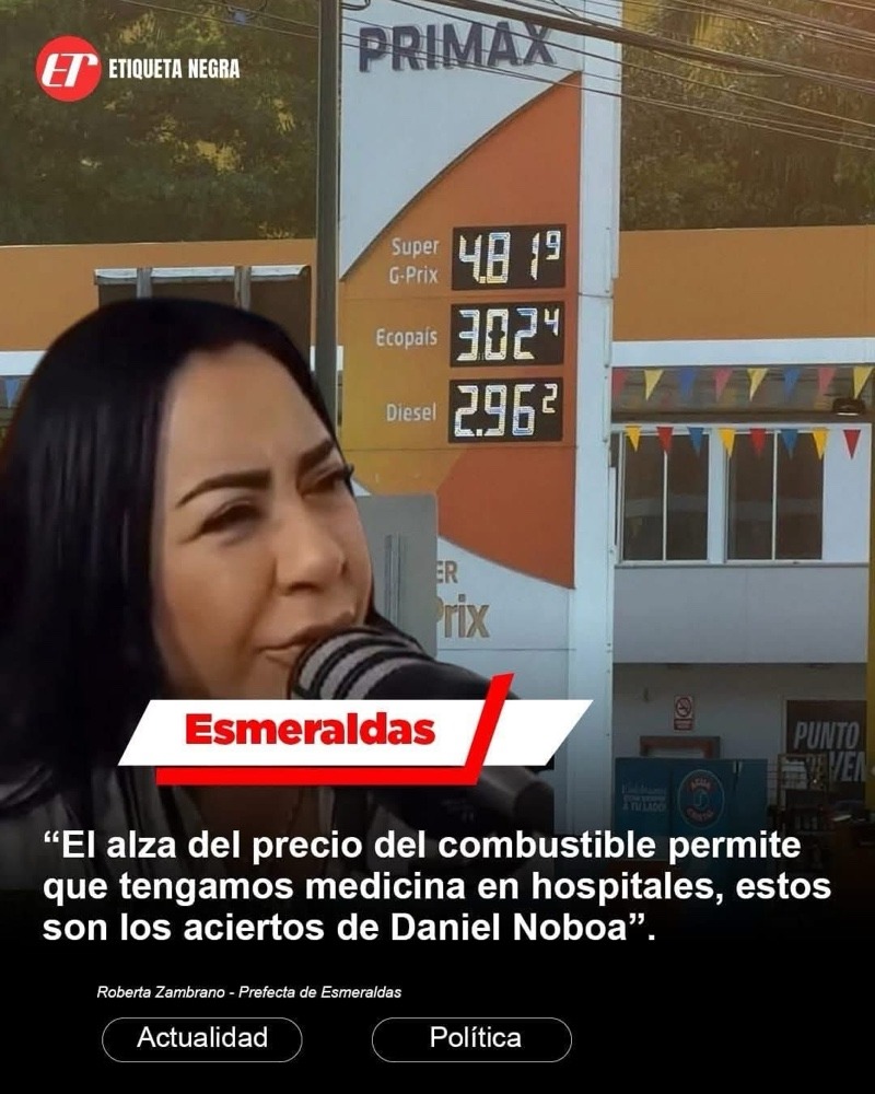 En redes sociales circula una imagen atribuida a la prefecta de Esmeraldas, Roberta Zambrano, con la frase: “El alza del precio del combustible permite que tengamos medicina en hospitales, estos son los aciertos de Daniel Noboa”.