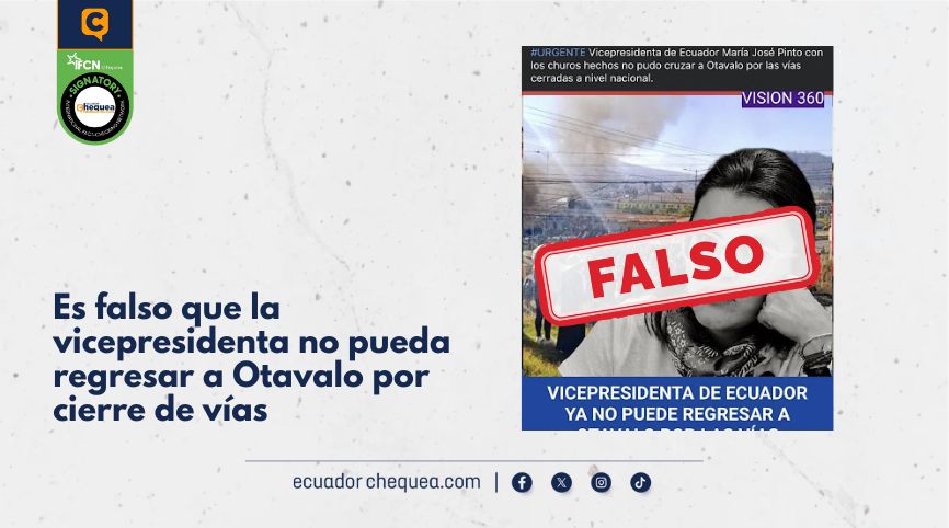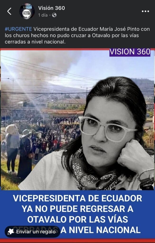 Un ejemplo de esto se puede encontrar en una publicación difundida por la página de Facebook Visión 360, recurrente en temas de desinformación y, además, una de las cuentas que usurpa la imagen y nombre de otros espacios informativos para compartir datos falsos o declaraciones descontextualizadas. Este post asegura que la vicepresidenta, María José Pinto, “ya no puede regresar a Otavalo por el cierre de vías a nivel nacional”.