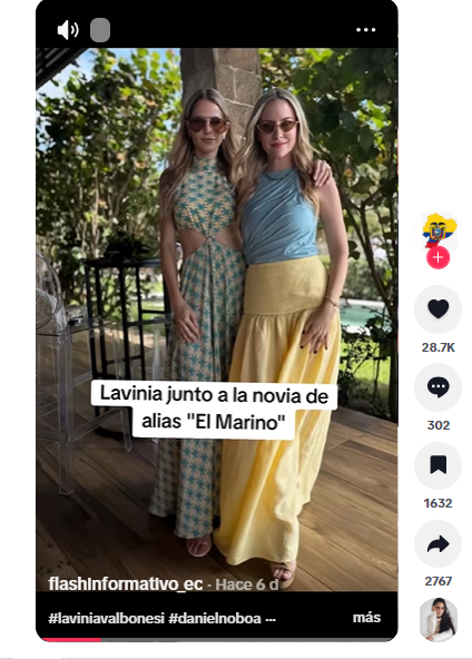 En TikTok circula un video que intenta vincular a la primera dama del Ecuador, Lavinia Valbonesi, con el entorno de alias «el Marino», excabecilla de la organización criminal Los Lagartos, a través de una fotografía.
