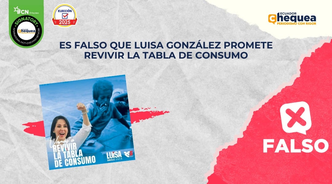 En Facebook, una publicación asegura que la candidata del correísmo, Luisa González, habría dicho que promete revivir la tabla de consumo de drogas. Se califica este contenido como falso. Luisa González no ha dicho la frase que se le atribuye. La imagen está editada y usurpa la tipografía de la campaña de González. El equipo de comunicación de la candidata desmintió la publicación.