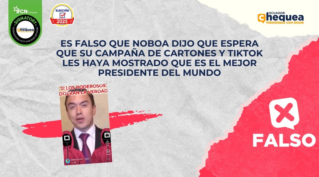El video en el que supuestamente aparece Daniel Noboa, presidente-candidato, diciendo que espera que su campaña les haya hecho saber que es el mejor presidente del mundo y que no se fijen en la subida de precios de la canasta básica y la inseguridad es falso. DeepWare, herramienta que detecta contenido generado por inteligencia artificial, reportó un 22% de probabilidad de que el video sea generado por esta tecnología. Tampoco se encontraron registros de que estas declaraciones hayan sido dadas por