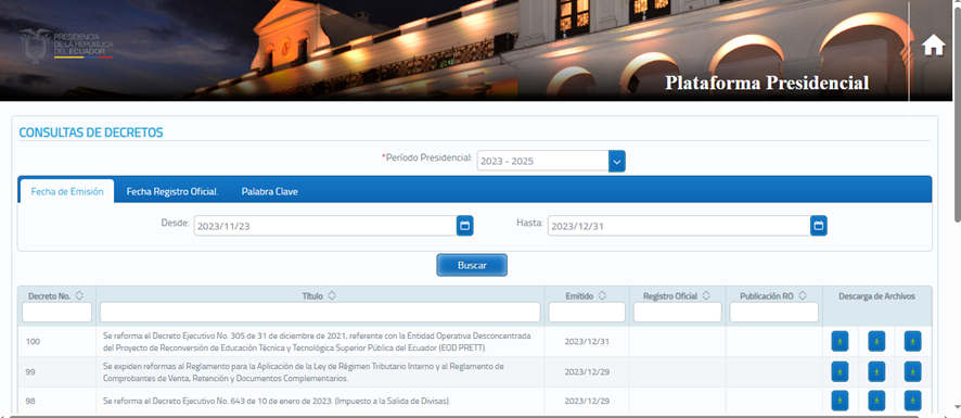 Una revisión en el portal oficial de la Presidencia de la República del Ecuador, sección Decretos Ejecutivos, confirma que entre el 23 de noviembre y el 31 de diciembre de 2023 no se registró ningún estado de excepción.