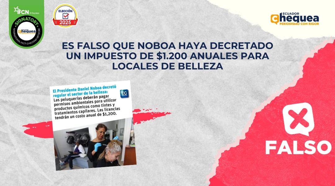 En TikTok, un video asegura que el presidente-candidato, Daniel Noboa, decretó un impuesto de $1.200 anuales para locales de belleza. Todo esto acompañado de los logos y tipografía de El Comercio. Se califica este contenido como falso. El presidente-candidato no ha firmado un decreto para que los locales de belleza paguen $1.200. La publicación no fue realizada por El Comercio, esta usurpa los logos y tipografía del medio.