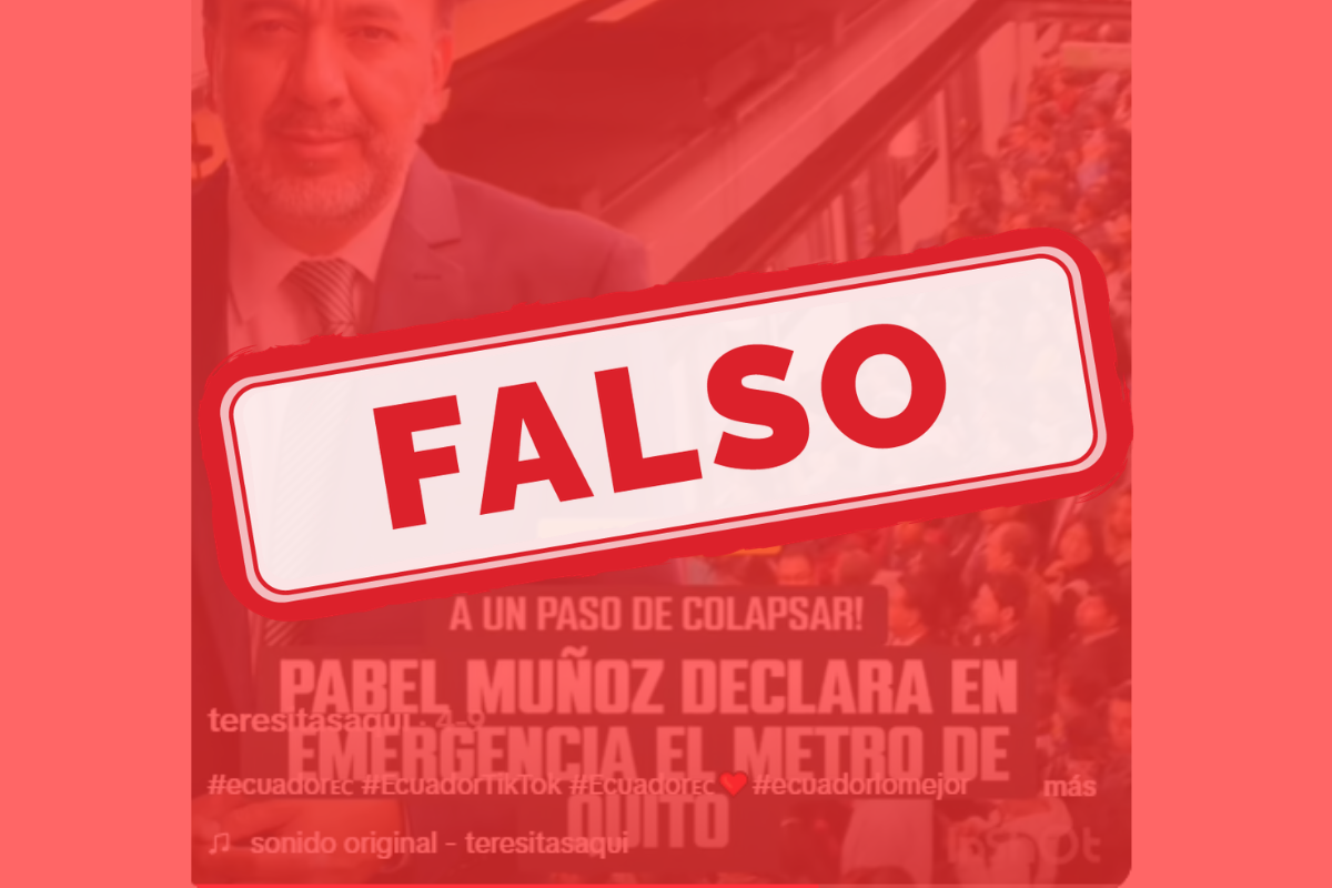 En TikTok circula una publicación que asegura que el alcalde de Quito, Pabel Muñoz, habría declarado una emergencia en el Metro de Quito debido a que el sistema estaría “a un paso de colapsar”.