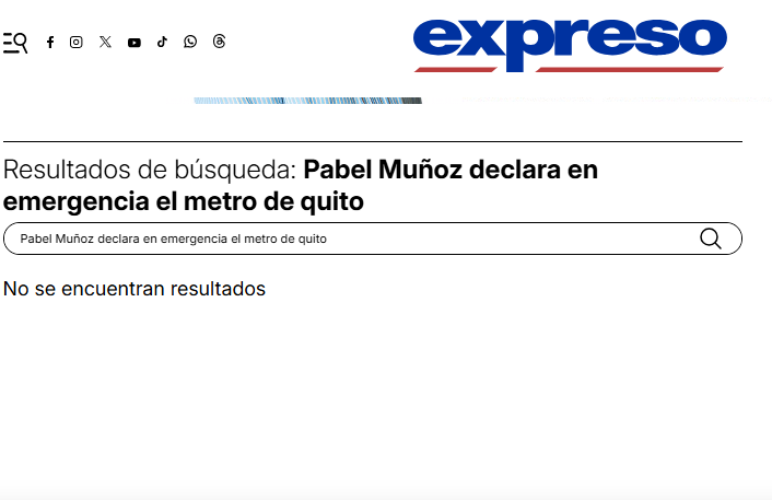 Una búsqueda directa en Diario Expreso confirma que el medio no ha publicado ninguna noticia con ese contenido. No existe registro de que haya informado sobre una declaratoria de emergencia en el Metro de Quito en esos términos.