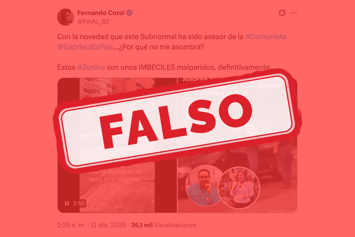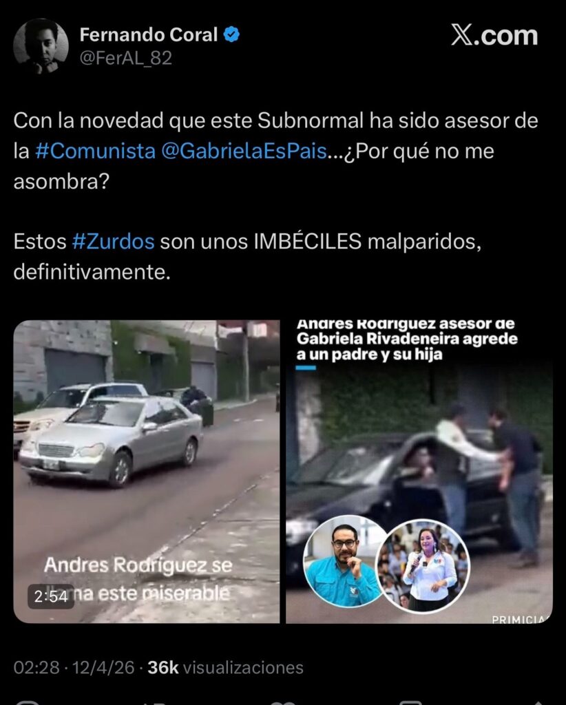 En X, desde la cuenta @FerAl_82, y otras plataformas circula una publicación que toma un video real de una agresión vial ocurrida en Quito y le añade una segunda imagen con un cintillo que dice que “Andres Rodriguez asesor de Gabriela Rivadeneira agrede a un padre y su hija”.