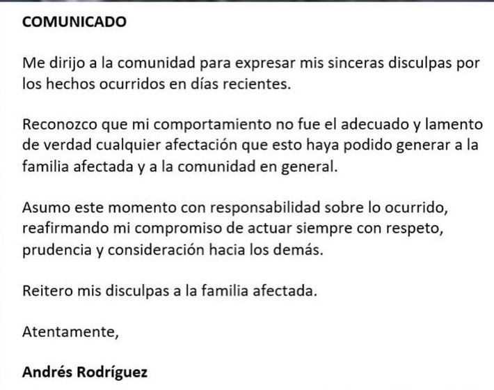 Por otro lado, desde su perfil de redes sociales, Rodríguez emitió un comunicado en el que pide disculpas por su accionar.
