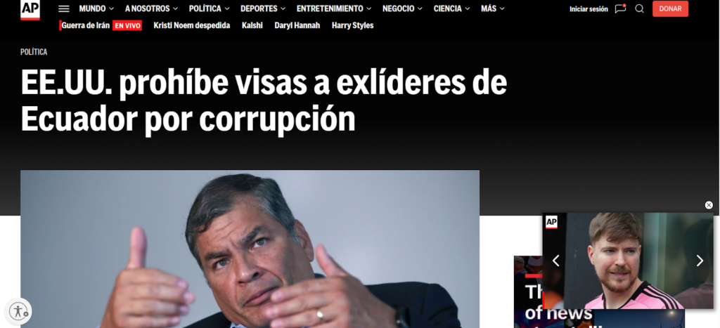 - Associated Press: reporte sobre la sanción migratoria y el contexto de Correa: https://apnews.com/article/ecuador-president-rafael-correa-jorge-glas-visa-07816829c0efadfbbcd32ea18f4efccd