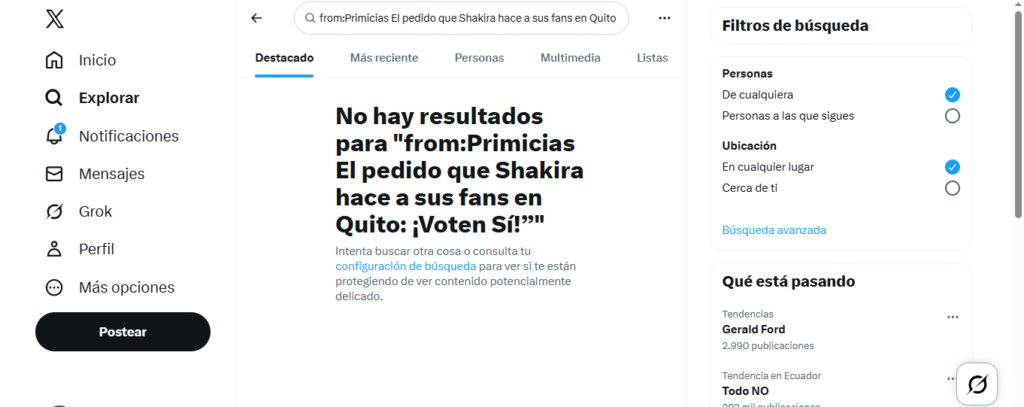 Asimismo, una búsqueda con palabras clave y revisión de transmisiones en vivo (Facebook y TikTok) muestran que Shakira no se ha pronunciado sobre la consulta popular ni ha emitido mensajes políticos durante sus presentaciones en Ecuador.