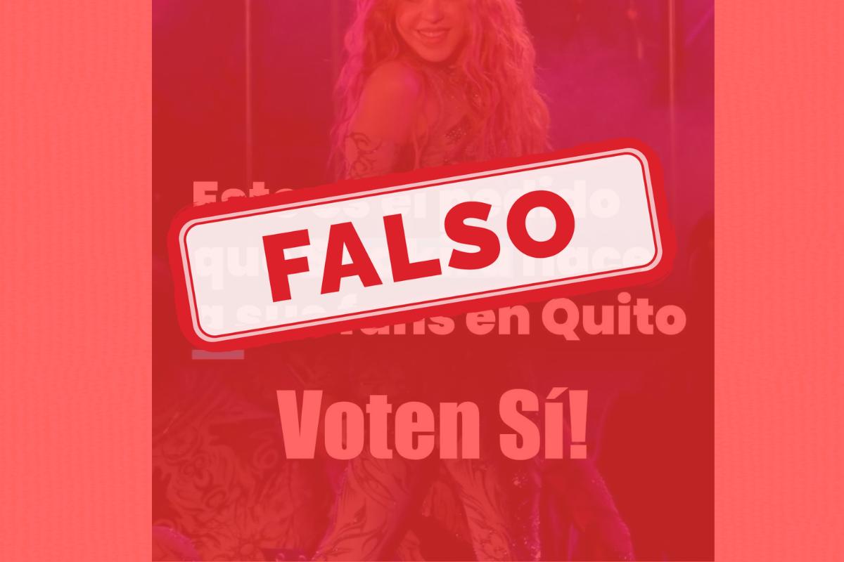 Una imagen con apariencia de portada de Primicias se difunde en redes sociales. En ella se lee una frase atribuida a la cantante colombiana Shakira, quien actualmente ofrece conciertos en Ecuador: “Este es el pedido que Shakira hace a sus fans en Quito. ¡Voten Sí!”.