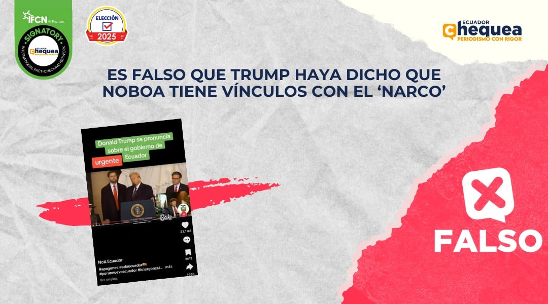 En el video desinformativo se escucha supuestamente decir a Donald Trump: “Apoyaremos a Ecuador luego de que se haya infiltrado el narcotráfico en las bananeras. Una de mis primeras acciones es condenar al Gobierno de Daniel Noboa, quien además de infiltrarse en mi posición está involucrado en el narcotráfico”.