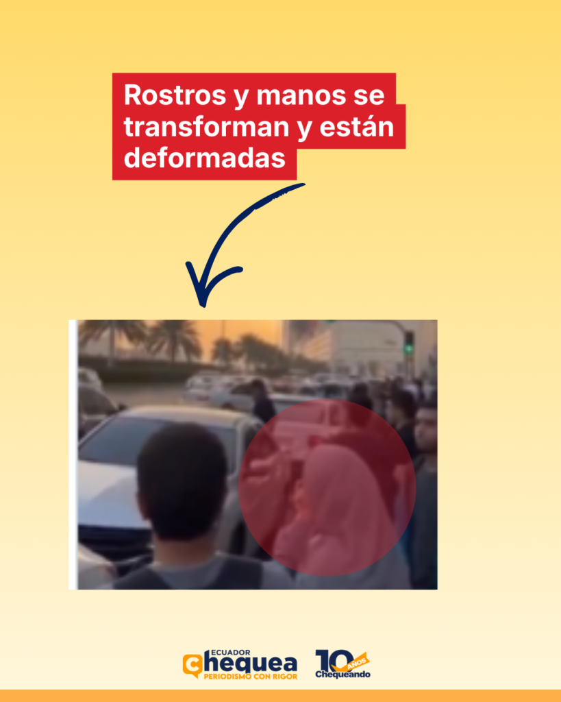 El edificio no coincide con estructuras reales del país y el material presenta múltiples errores visuales típicos de contenido generado con inteligencia artificial, como deformaciones faciales, movimientos incoherentes de vehículos y cambios abruptos en los elementos del entorno. Además, herramientas especializadas catalogaron el clip como 100% manipulado.