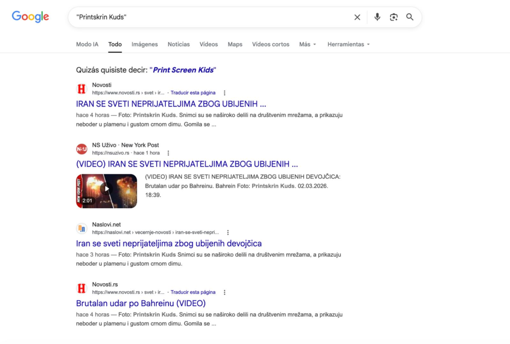 Adicionalmente, en la imagen del video se incluye un crédito atribuido a un nombre que no registra antecedentes digitales previos ni evidencia de actividad anterior. Según la revisión realizada, dicho nombre corresponde a una supuesta página de origen ruso cuya existencia no pudo ser verificada antes de la fecha en que comenzó a circular el contenido. Estos elementos, en conjunto, constituyen indicios relevantes sobre la falta de transparencia en el origen del material y refuerzan la necesidad de analizarlo con criterios de verificación rigurosos.
