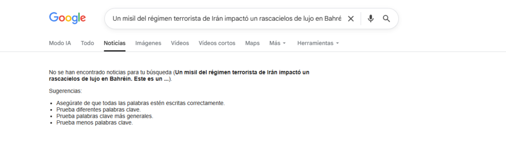 Ecuador Chequea realizó una búsqueda avanzada en Google con palabras clave relacionadas con el supuesto ataque en Bahréin, pero no identificó reportes de medios de comunicación que informaran sobre un impacto de misil en un rascacielos de lujo en ese país.