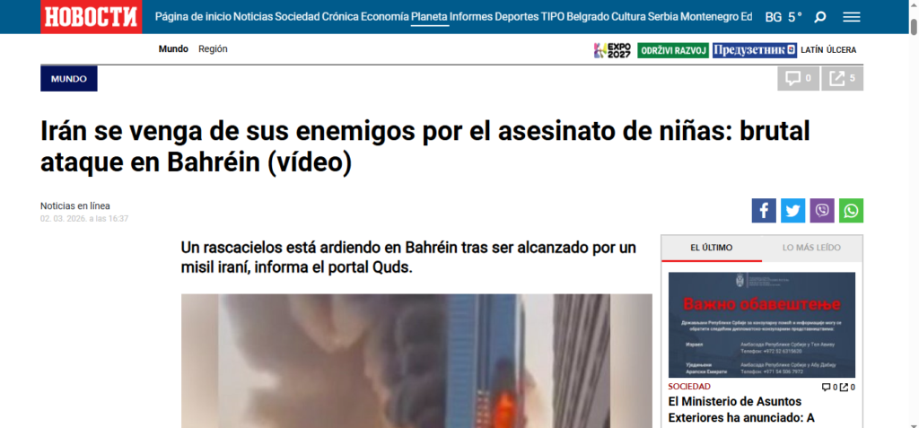 En X circula un video que supuestamente muestra el impacto de un misil lanzado desde Irán contra un rascacielos de lujo en Bahréin. La grabación ha sido compartida por diversas cuentas sin aportar fuentes verificables ni información contextual que respalde la autenticidad de las imágenes.