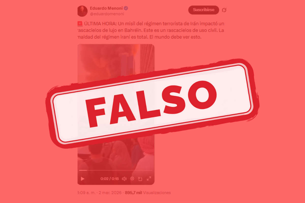En X circula un video que supuestamente muestra el impacto de un misil lanzado desde Irán contra un rascacielos de lujo en Bahréin. La grabación ha sido compartida por diversas cuentas sin aportar fuentes verificables ni información contextual que respalde la autenticidad de las imágenes.