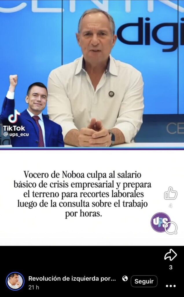 La crisis política ha facilitado que la desinformación surja desde diferentes aristas. Un ejemplo de esto se puede ver en una publicación realizada en Facebook, por una página llamada ‘Revolución de izquierda por un futuro mejor’, en la que se asegura que un vocero del Gobierno de Daniel Noboa “culpa al salario básico de crisis empresarial y prepara el terreno para recortes laborales luego de la consulta sobre el trabajo por horas”. Esto lo hace también bajo un logo que dicta ‘UPS’ y un estilo sobrio.
