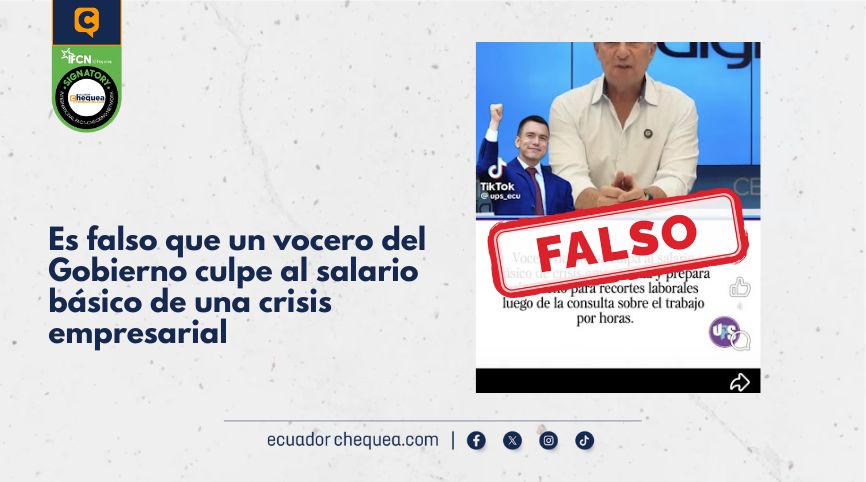 La crisis política ha facilitado que la desinformación surja desde diferentes aristas. Un ejemplo de esto se puede ver en una publicación realizada en Facebook, por una página llamada ‘Revolución de izquierda por un futuro mejor’, en la que se asegura que un vocero del Gobierno de Daniel Noboa “culpa al salario básico de crisis empresarial y prepara el terreno para recortes laborales luego de la consulta sobre el trabajo por horas”. Esto lo hace también bajo un logo que dicta ‘UPS’ y un estilo sobrio.