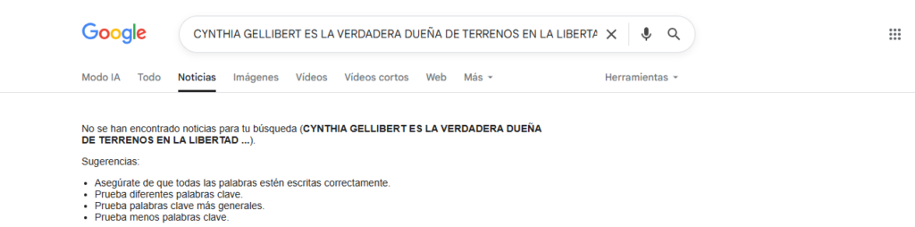 Asimismo, una búsqueda en Google no arrojó registros de que Vistazo u otro medio haya publicado información que sostenga que Cynthia Gellibert es dueña de terrenos en La Libertad.