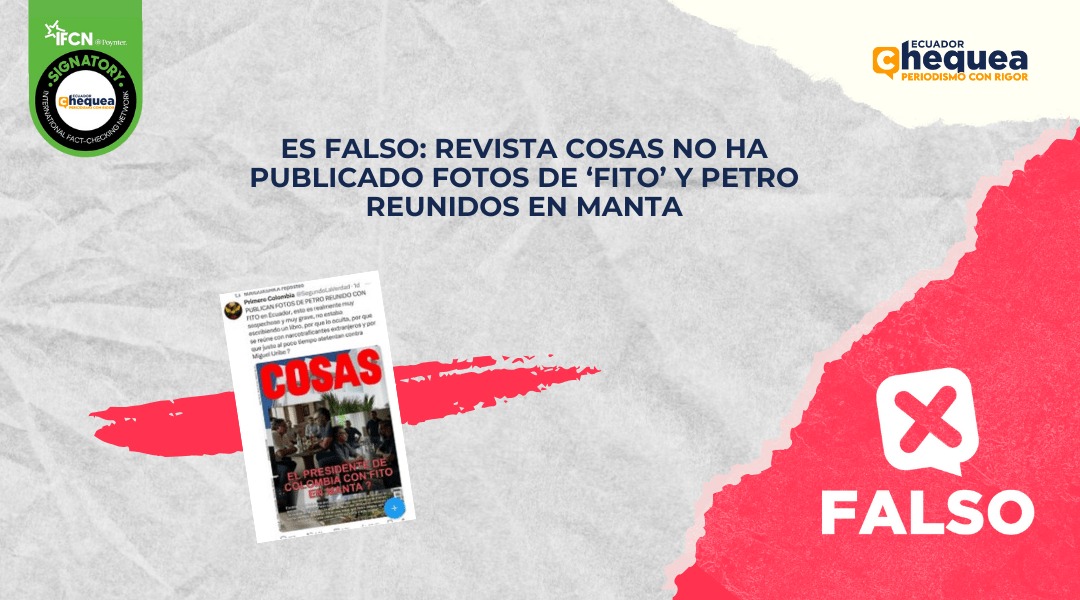 Bajo este contexto, una publicación en X asegura que la revista Cosas habría publicado que alias ‘Fito’ se reunió con el presidente de Colombia, Gustavo Petro, en Manta. Se califica este contenido como falso. La revista Cosas no ha publicado lo que se le atribuye. No hay registros de dicho post en ninguna red oficial de la revista. La supuesta fotografía de Petro y ‘Fito’ fue generada con IA. Además, el post usurpó los logos y tipografía del medio.
