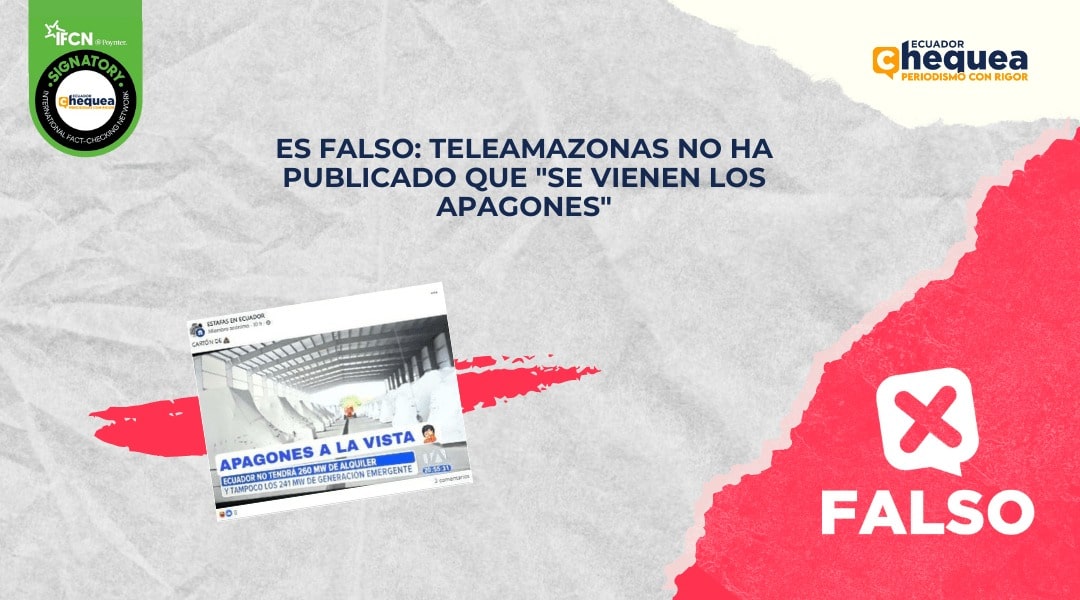 Al respecto, una publicación en Facebook asegura que Teleamazonas habría publicado que hay apagones a la vista, ya que Ecuador no tendrá 260 mw de alquiler. Se califica este contenido como falso. Teleamazonas no realizó esa publicación. La página de Facebook manipuló un reportaje del canal. En el post original se informa que Celec declaró desierto el concurso para contratar 260 MW en Pascuales y en ninguna parte dan una fecha sobre apagones.