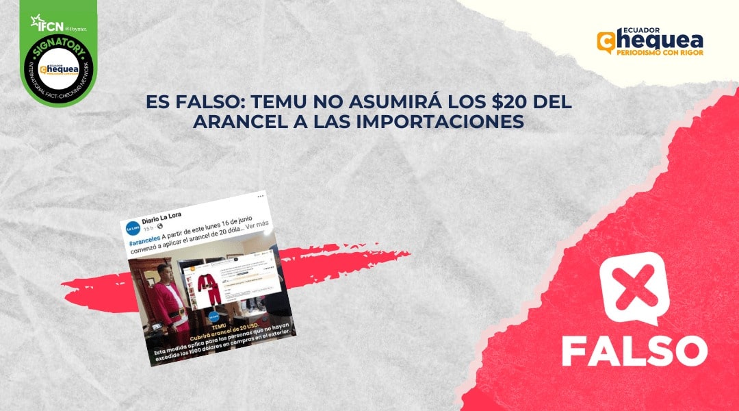 El tema, ha causado que los desinformadores empiecen a hacer de las suyas. Por ejemplo, en Facebook, una publicación asegura que Temu cubrirá el arancel de $ 20. Se califica este contenido como falso. No se ha encontrado ningún comunicado oficial de Temu. La aduana señaló que no tiene información oficial al respecto. Además, el contenido usa una tipografía y colores que imitan a los del diario La Hora, pero con una modificación en el nombre por ‘Diario La Lora’. Desde Geomil indicaron que no tienen ninguna información específica sobre Temu.