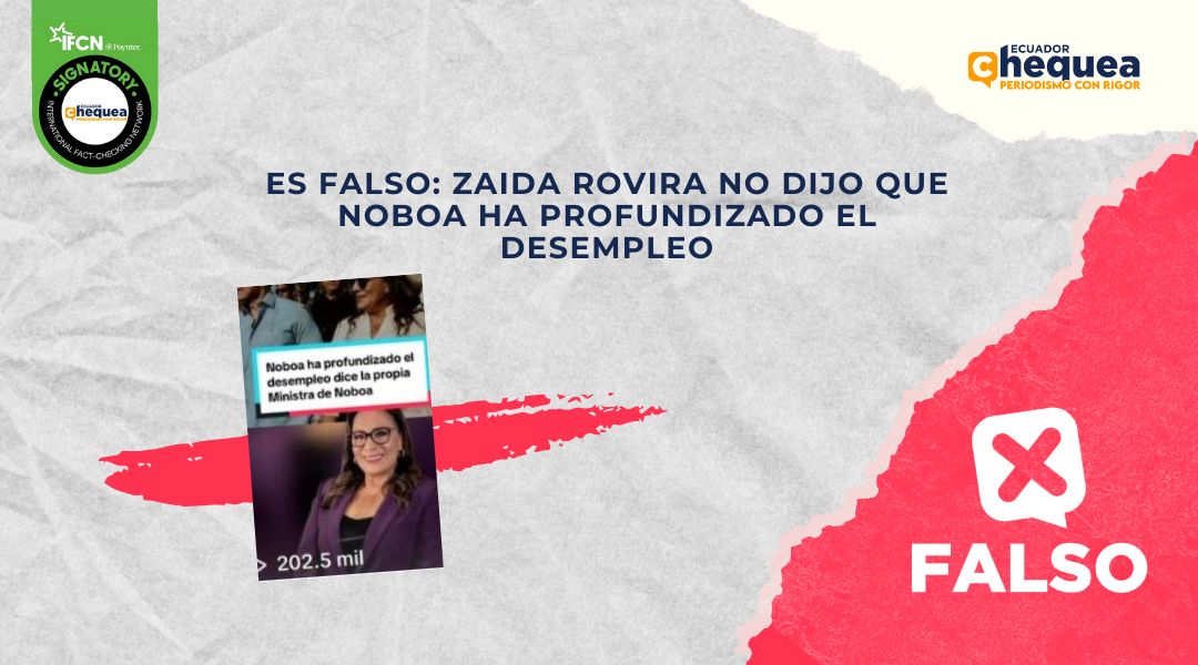 Al respecto, una publicación en TikTok asegura que la ministra de Gobierno, Zaida Rovira, habría dicho que el presidente, Daniel Noboa, ha profundizado el desempleo. Se califica este contenido como falso. Rovira no dijo que Noboa ha profundizado el desempleo. En ninguna parte de la entrevista con Ecuavisa culpó a Daniel Noboa sobre el desempleo. La funcionaria dijo que la pregunta sobre el trabajo por horas se la hace porque “nuestra sociedad es cambiante y las necesidades que tiene la ciudadanía, no son las mismas que tenían en aquel momento”, en referencia a la consulta popular de 2024, que también fue planteada por Noboa; sin embargo, entonces proponía que se reforme la Constitución y se permita en general el trabajo por horas.