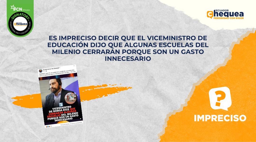 Al respecto, una publicación en Facebook asegura que el viceministro de Educación, Gustavo Ayala, habría dicho que algunas escuelas del milenio van a cerrar porque son un gasto innecesario. Se califica este contenido como impreciso. El Viceministro de Educación sí dio esa declaración ayer en la inauguración del año escolar que se realizó en la Unidad Educativa César Dávila Andrade, en Cuenca. Ayala aseguró que algunas escuelas del milenio serán rehabilitadas, mientras otras cerrarán, porque fueron, tal vez, un gasto innecesario para el país y hoy están enfocados en otro tipo de escuelas. La nueva estrategia busca priorizar instituciones pequeñas y cercanas a las comunidades rurales, para mejorar el acceso y la calidad educativa en todo el país.