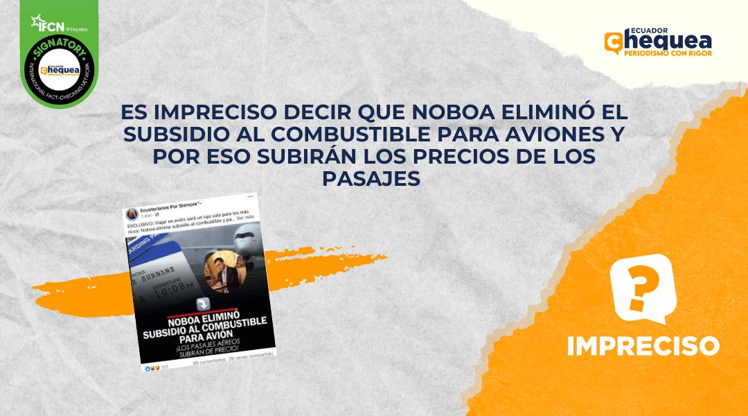 Una publicación en Facebook asegura que el presidente, Daniel Noboa, eliminó el subsidio al combustible de avión y por eso ahora subirán los precios de los pasajes aéreos. Se califica este contenido como impreciso. El subsidio al combustible de avión fue eliminado, pero los precios serán analizados. Noboa eliminó el subsidio del 40 % al combustible de aviación en aeropuertos administrados por la DGAC y terminales municipales no concesionadas, exceptuando rutas a Galápagos y paradas técnicas. La medida busca reducir el gasto público.