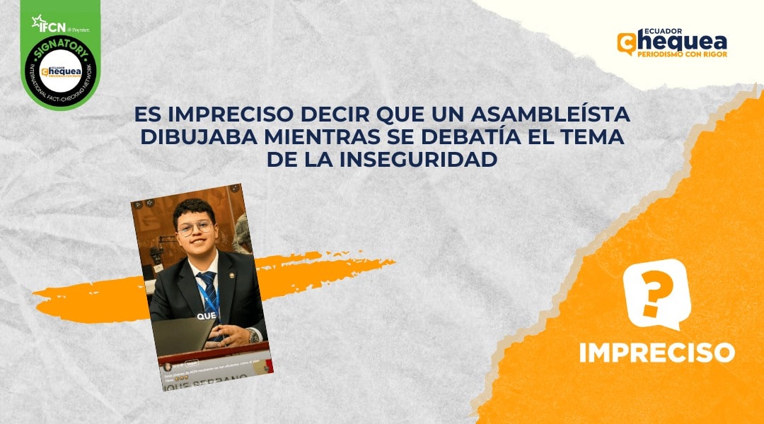 El post a verificar asegura que el asambleísta de 19 años, Dominique Serrano, fue captado dibujando mientras se debatía el tema de la inseguridad en medio de una sesión en la Asamblea. Sin embargo, ese dato no es correcto. El legislador fue captado dibujando durante la sesión número 7, de la Comisión de Transparencia y Control Social mientras se fiscalizaban los contratos con Progen y Austral, que firmaron contratos con el Gobierno para la provisión de equipos de generación eléctrica en el contexto de la crisis energética del país.