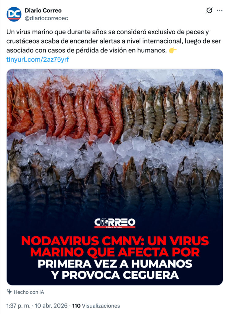 En la red social X circula una publicación, desde la cuenta denominada: “Diario Correo” que advierte sobre un supuesto virus marino, el Nodavirus de Mortalidad Encubierta (CMNV), que presuntamente habría comenzado a afectar a humanos, causando pérdida de visión e incluso ceguera.