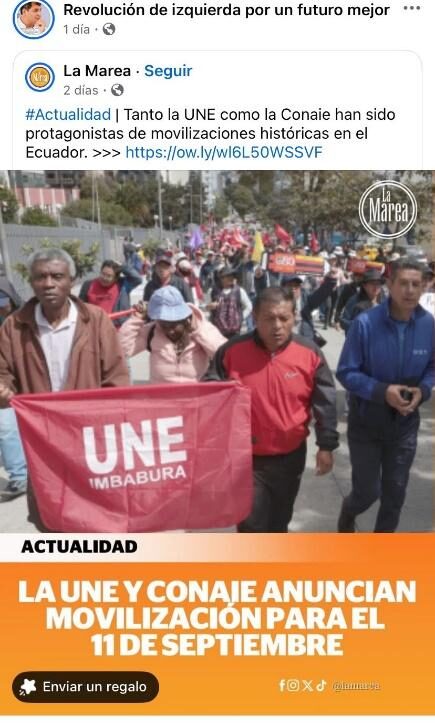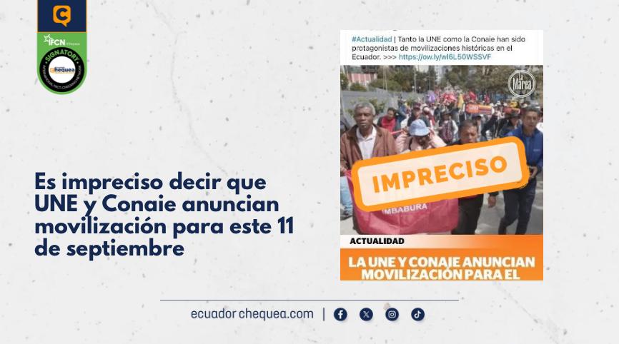 El tema tiene a más de uno opinando en redes sociales y varios contenidos han circulado. Un post en Facebook, asegura que la Unión Nacional de Educadores (UNE) junto a la Confederación de Nacionalidades Indígenas del Ecuador (Conaie), anunciaron movilizaciones para el 11 de septiembre, dando a entender que ambas organizaciones son las convocantes. Se califica este contenido como impreciso.