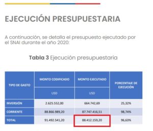 En el documento de Rendición de Cuentas del Snai de 2020, se reconoce que hubo una reducción de su presupuesto en USD 15 millones debido a la pandemia del COVID-19, aún así su presupuesto total sería de USD 103.412.159,20, muy por debajo del dato aportado por Cobo.