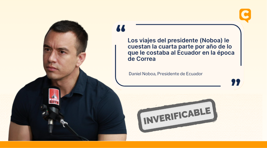 El presidente Daniel Noboa aseguró que los viajes de su gobierno cuestan apenas una cuarta parte de lo que se gastaba en la administración de Rafael Correa. Sin embargo, no existe información pública, completa ni comparable que permita sostener esa afirmación.