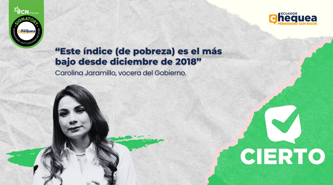 Al revisar los datos presentados por el Instituto Nacional de Estadística y Censos (INEC), en su boletín denominado Encuesta Nacional de Empleo, Desempleo y Subempleo (Enemdu) de junio, se evidencia que las cifras presentadas por Jaramillo corresponden a una disminución de pobreza entre junio de 2024 y junio de 2025, ya que ahora se ubica en 24%. En el mismo informe, la entidad asegura que “no existe una diferencia estadísticamente significativa entre junio 24 – junio 25”.