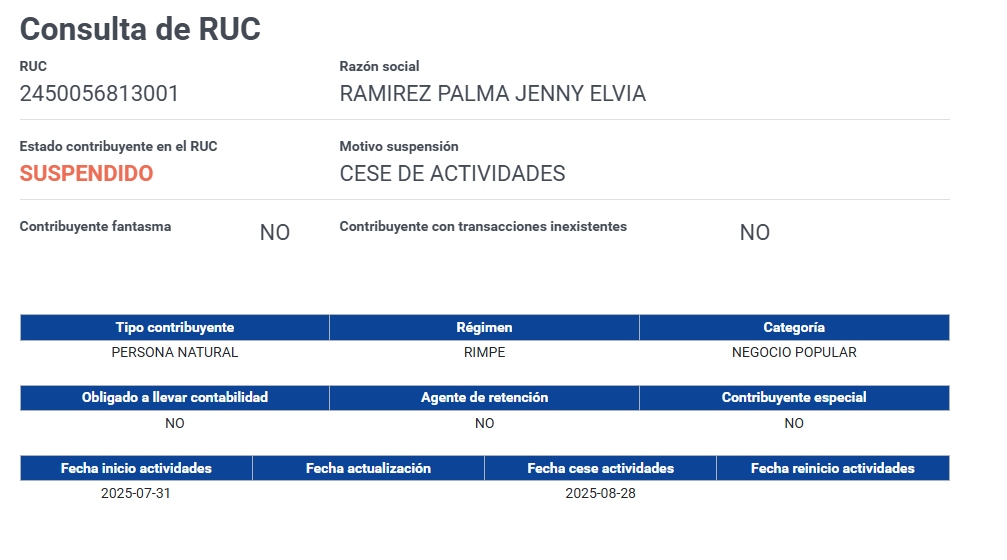 De acuerdo con la base de datos del SRI, Ramírez Palma está registrada con el RUC 2450056813001, bajo el régimen RIMPE, en la categoría de Negocio Popular. El organismo tributario indica que no figura como contribuyente fantasma ni presenta transacciones inexistentes.