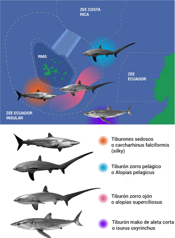Las especies detectadas fueron Alopias pelagicus (tiburón zorro pelágico), Prionace glauca (tiburón azul), Carcharhinus falciformis(tiburón sedoso) y Sphyrna zygaena (tiburón martillo liso). Según la Lista Roja de la Unión Internacional para la Conservación de la Naturaleza (UICN), Alopias pelagicus está catalogado como En Peligro; Carcharhinus falciformis y Sphyrna zygaena como Vulnerables; y Prionace glauca como Casi Amenazado.