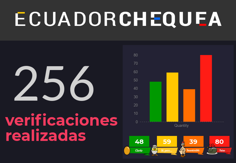 Ecuador Chequea nació en octubre de 2016 y desde entonces no ha cesado en su afán por determinar el nivel de precisión de las afirmaciones que exponen las autoridades políticas. Pero ese no ha sido su único interés. Como portal especializado en verificación, confirma la veracidad de los contenidos que se publican a través de redes sociales y aplicaciones de mensajería como Whatsapp. ¡Conoce más de nuestro trabajo y no comas cuento!