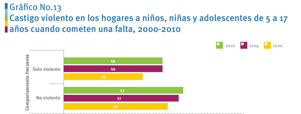 En el país esta realidad no es diferente dentro del hogar, ni en el sistema educativo. De acuerdo al Consejo Nacional para la Igualdad Intergeneracional, la Unicef, y el Observatorio Social del Ecuador, en su informe ‘La niñez y adolescencia en el Ecuador contemporáneo: avances y brechas en el ejercicio de derechos’, la cultura de la crianza es violenta. «El 44% de los niños de 5 a 17 años está expuesto casi siempre a castigos violentos (golpes, insultos, encierro) en sus hogares.»