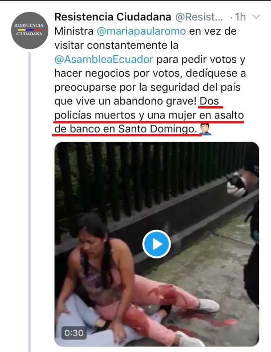 Desde la tarde de este 3 de abril se difunde a través de WhatsApp y redes sociales un video en que policías y médicos atienden en la calle a una mujer herida. En segundo plano se observa a un uniformado tendido en el piso, presuntamente herido de bala. En Twitter se asegura que se trata de un asalto a una entidad financiera en Santo Domingo de los Tsáchilas. La Policía Nacional de Ecuador desmintió ese mensaje e informó que las imágenes corresponden a un simulacro.