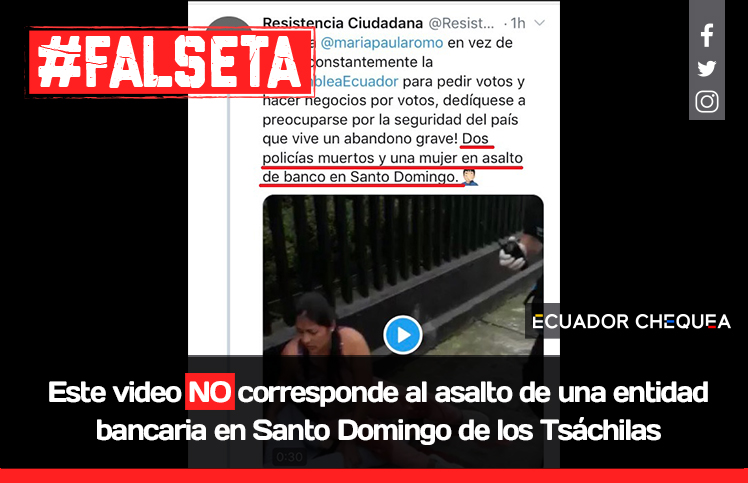 Desde la tarde de este 3 de abril se difunde a través de WhatsApp y redes sociales un video en que policías y médicos atienden en la calle a una mujer herida. En segundo plano se observa a un uniformado tendido en el piso, presuntamente herido de bala. En Twitter se asegura que se trata de un asalto a una entidad financiera en Santo Domingo de los Tsáchilas. La Policía Nacional de Ecuador desmintió ese mensaje e informó que las imágenes corresponden a un simulacro.