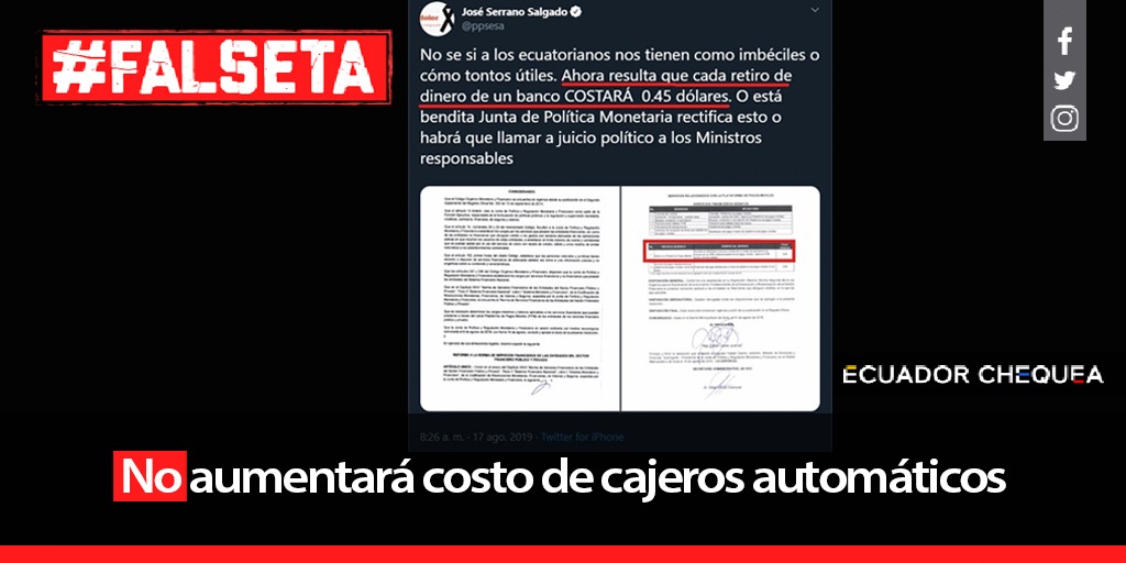 Esta vez circuló por redes sociales un supuesto documento membretado con el logo de la Junta de Regulación Monetaria Financiera, donde se asegura, en uno de los tres renglones, que aumentará a 0,45 centavos de dólar retirar efectivo de un ATM (Cajero automático) incluso, si se realiza con tarjeta de cuentas provenientes de la propia entidad bancaria. Esto dice el comunicado: