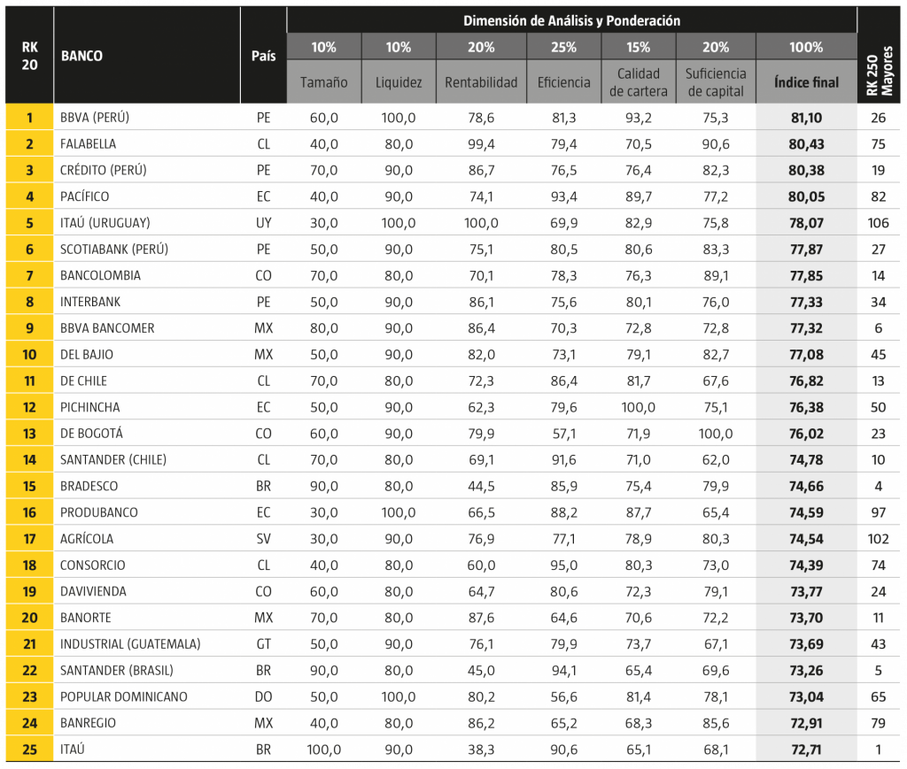 La metodología de la revista especializada se basa en seis aspectos, cuando los bancos se acercan a un funcionamiento óptimo su rendimiento bordea el 100 %: