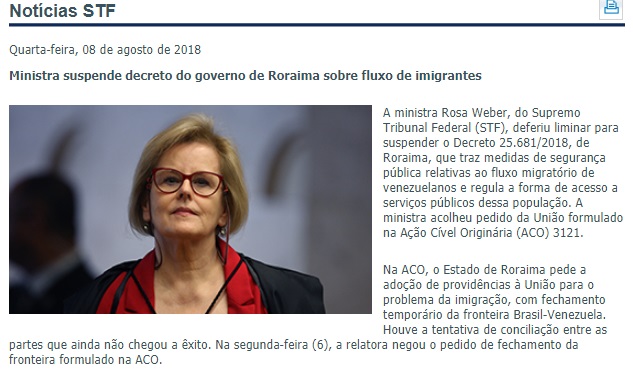Sin embargo, esta medida fue revertida a través de un dictamen de la ministra Rosa Weber, del Supremo Tribunal Federal (STF), la cual ordenó suspender el Decreto 25.681/2018, de Roraima, que ordena medidas de seguridad pública relativas al flujo migratorio de venezolanos y regula la forma de acceso a servicios públicos de esa población. La decisión de la magistrada se tomó menos de 24 horas después de haber sido emitido el decreto inicial. En el análisis preliminar del caso, la ministra Weber determinó que la permanencia de los efectos, que puedan tener estas decisiones, deben ser considerada atentatoria a la dignidad de la justicia, y no debe ser tolerada.