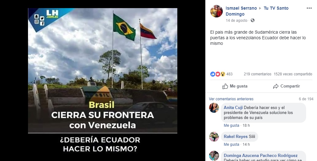 Es decir, pese a que la medida fue levantada en menos de 24 horas, algunos usuarios de Facebook continúan difundiendo esta información como si fuese real. En este caso, el post está acompañado de un texto en el que se incita a pedir un cierre de fronteras por parte de los ciudadanos a las autoridades ecuatorianas.