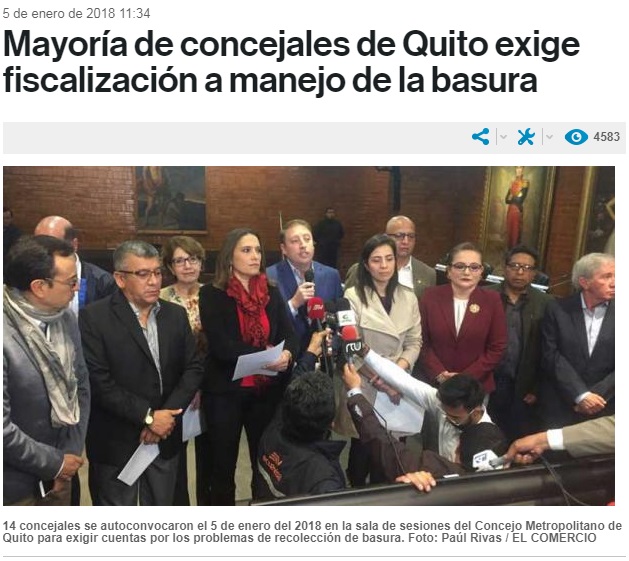 ECUADOR CHEQUEA buscó el origen de esta imagen y la encontró en una nota. La noticia se refiere a una sesión realizada el 5 de enero por parte del Concejo Metropolitano, llevada a cabo por 14 concejales autoconvocados, en la que se trató la crisis de la capital provocada por los problemas en la recolección de la basura.