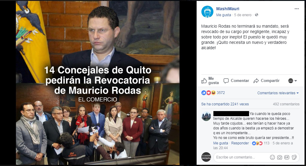 Desde el 5 de enero circula una publicación en Facebook en la cual se afirma que 14 Concejales de Quito pedirán la revocatoria del alcalde Mauricio Rodas. Este contenido es atribuido a Diario El Comercio, a pesar de que no contiene un enlace directo a dicha fuente, y ha sido compartido por distintos usuarios y páginas de la red social. Por ejemplo, en la página «Mashi Mauri» esta información cuenta con más de 2000 compartidos y 3500 interacciones.